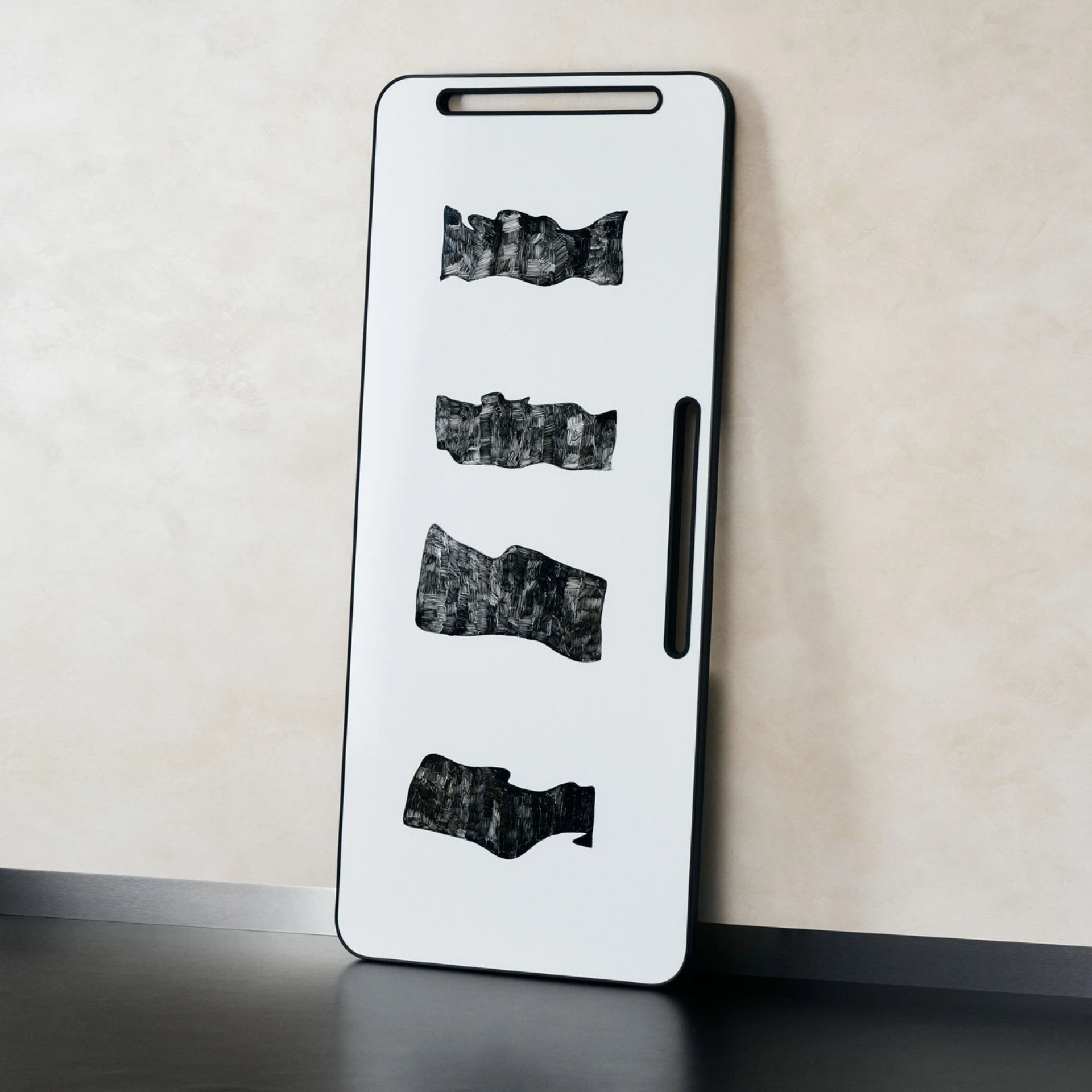 A writing board that is both mobile and fixed. The Note is double-sided, with two magnetic ceramic steel surfaces. Manufactured with a lightweight honeycomb core, Note is light enough to carry around and can easily be hung using the wall brackets included, or simply lean against a wall for spontaneous meetings.