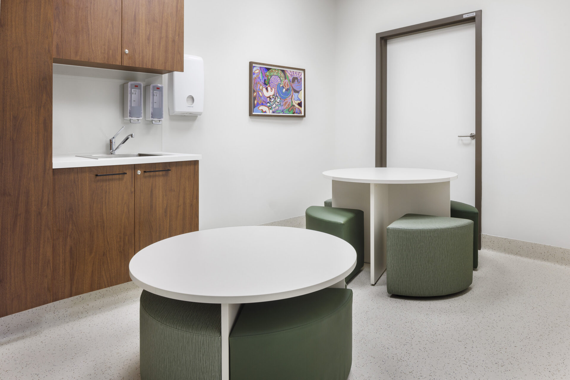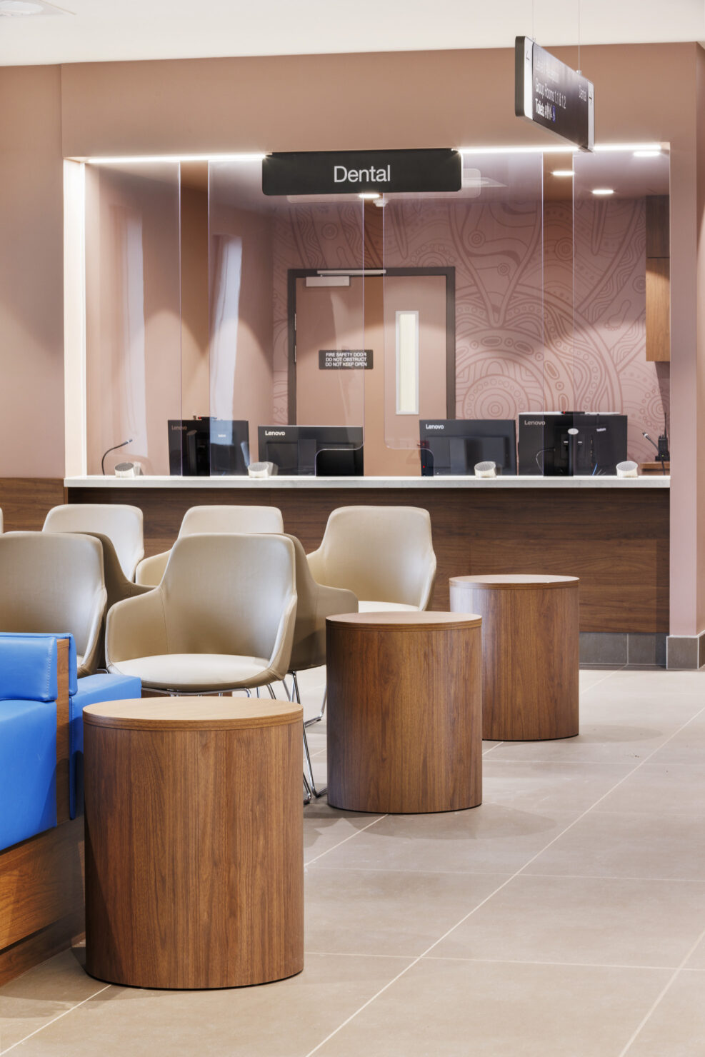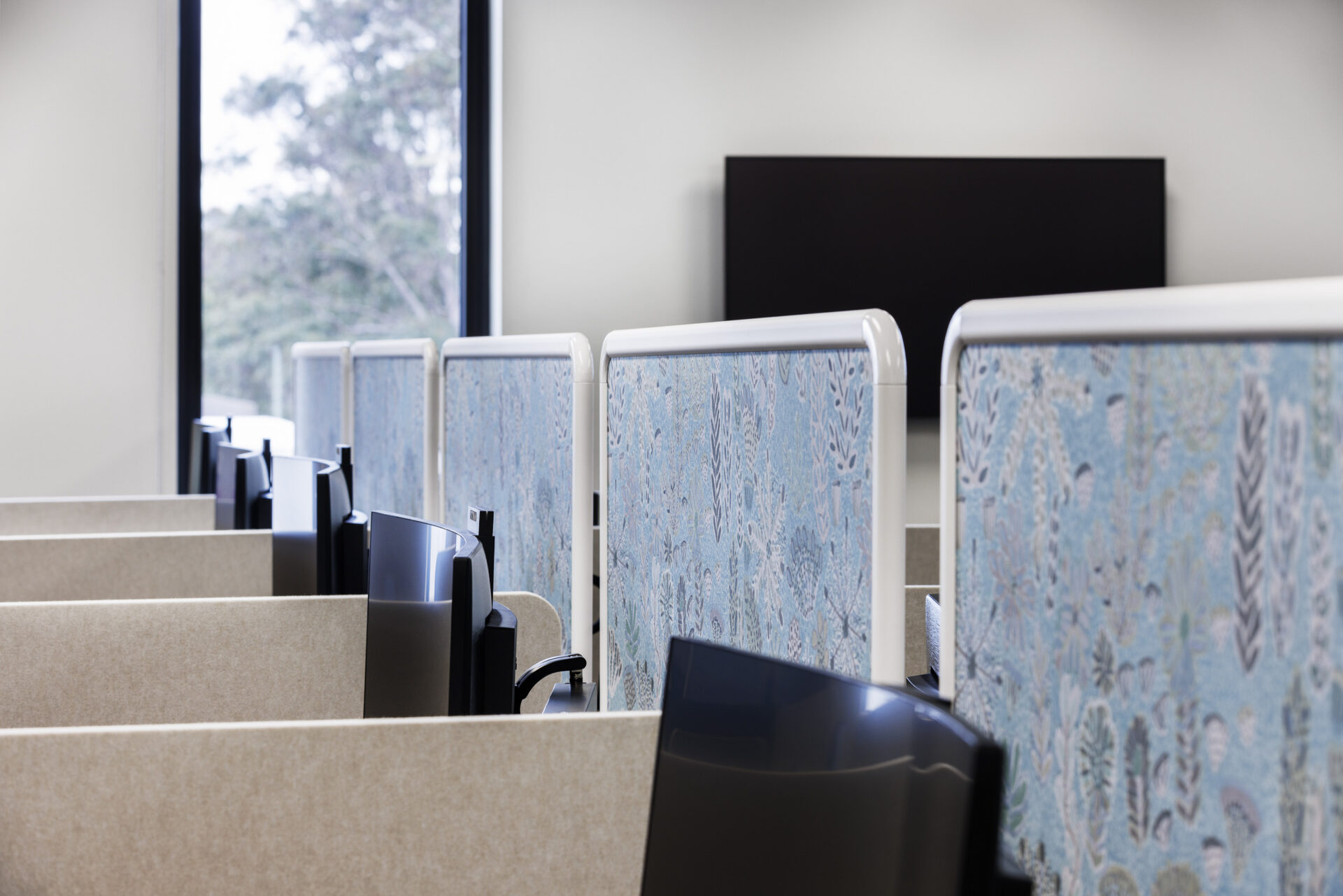 Beyond performance, the furniture strategy developed with Monash Health focused on comfort, wellbeing and the role of design in healing spaces. Autex acoustic screens featuring artwork by indigenous artist Willie Weston introduce a strong visual identity while contributing to quieter, more restorative workplaces. Custom-made drum tables were supplied for waiting areas, and purpose-designed children’s furniture catered to younger visitors.